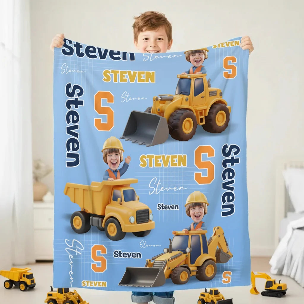 Mjuk filt med namn och anläggningsfordon - Personlig Filt För Barn