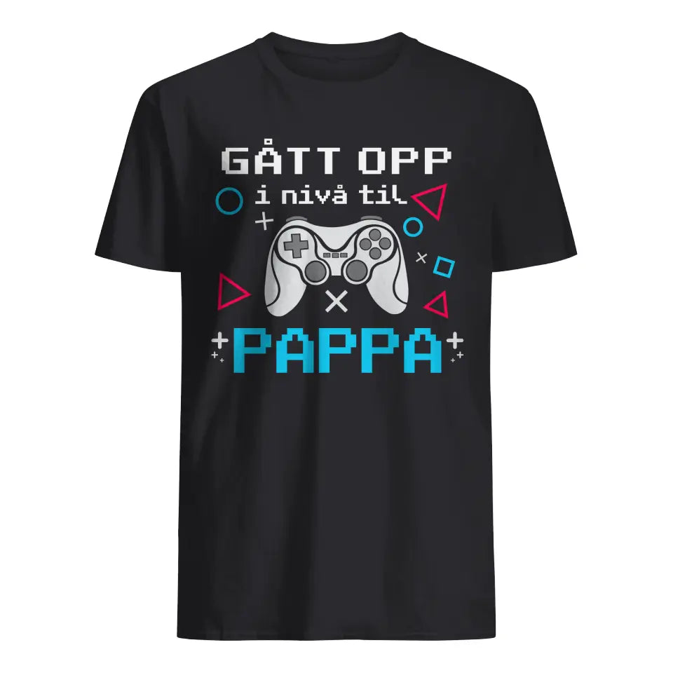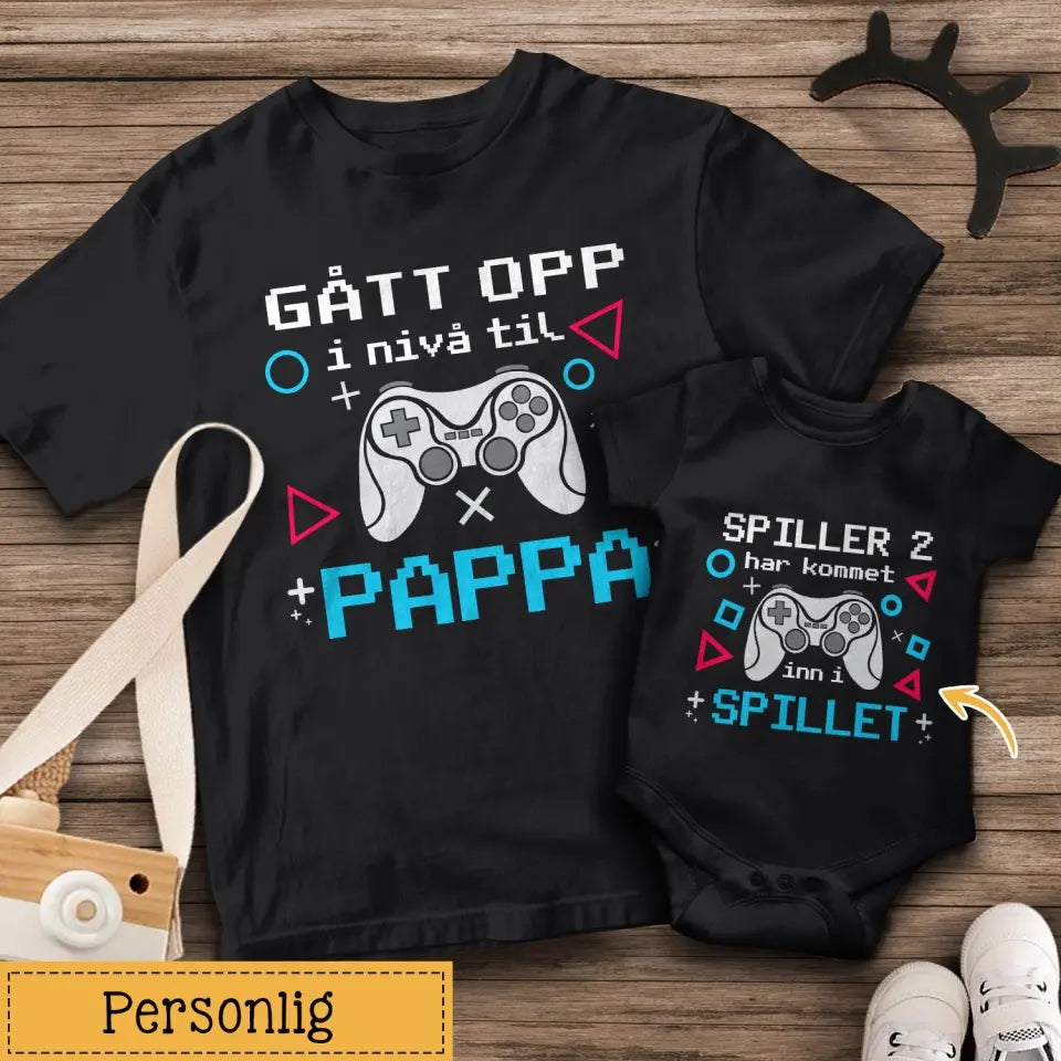 Personlig t-skjorte til nybakt pappa | Personlig gave til nybakt far | Opp i nivå til pappa spiller 2 har kommet inn i spillet