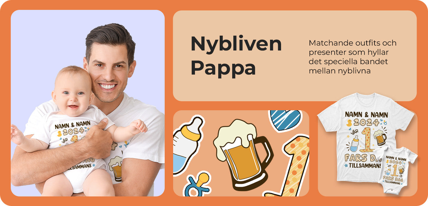 Den första Fars dag är ett ögonblick att minnas för alltid. Med Gavafam kan du skapa en personlig present för att överraska den nyblivna pappan med något alldeles speciellt. Välj bland tusentals produkter och designa en unik gåva som hyllar det nya, speciella bandet mellan honom och hans barn.